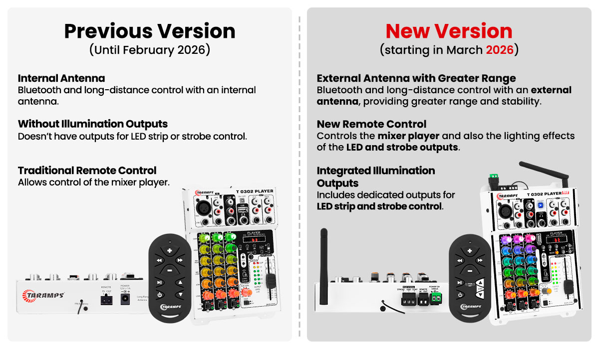 The mixer you already know and trust comes even more complete, featuring RGB Control, that permits control the system light effects – such as LED strips and strobe lights – in a practical and fully customizable way. This function supports LED strips with up to 300 LEDs connected in series and up to 10 strobe lights, all controlled through a long-range remote control.