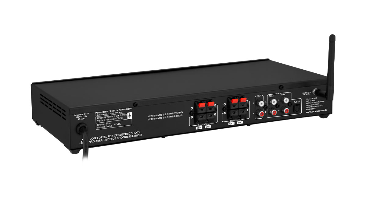 O THS 6000 oferece incríveis 400 WRMS distribuídos em 4 canais de 100 WRMS a 2 Ohms, garantindo um som potente e nítido. Além disso, ele tem a opção de conexão em ponte, oferecendo 200 WRMS a 4 Ohms por conexão, ideal para conectar subwoofers passivos.